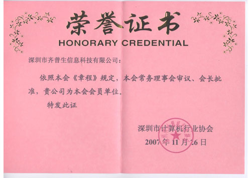 計算機行業(yè)協(xié)會會員榮譽(證書)
